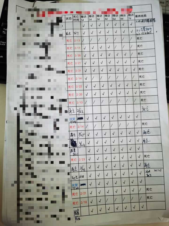 这是我们插管病人的随访表(部分),可以自己看看,随访到第七天,还有多少人活下来。